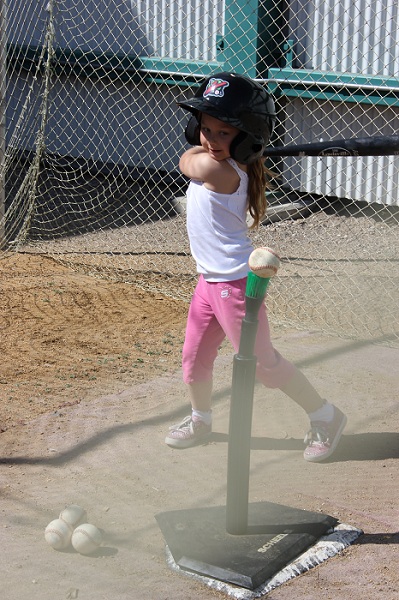The field itself definitely looked like the most fun part. After getting to sit in the dugouts just like the players, Sarah took the kids out for a run around the bases. After that, it was a little trip down the right field line for a shot in the batting cages. All the kids got a few swings at the same tees the Voyagers use. As you can see, there were a few major sluggers among the group.